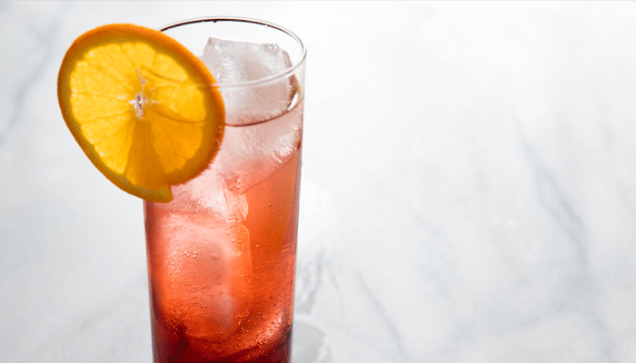 2. Tillsätt önskad mängd sodavatten och garnera med en skiva apelsin.