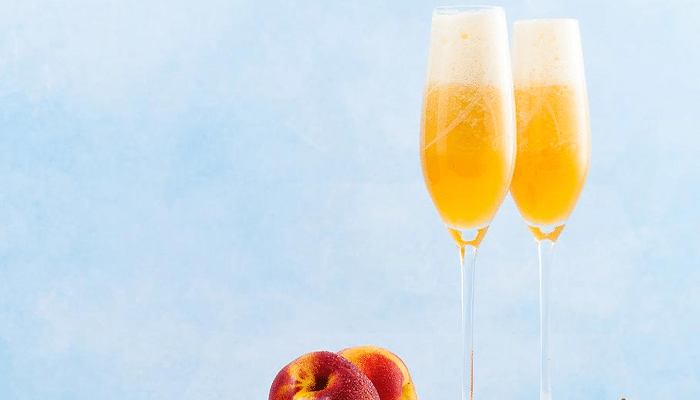 Byt ut persikorna ovan mot jordgubbar – och vips har du en Rossini. Drinken fungerar utmärkt som fördrink eller välkomstdrink till festen.