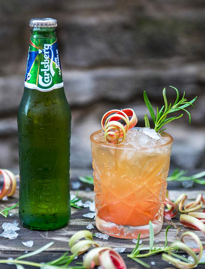 Mixa rosmarin med sockerlag och citronsaft. Blanda mixen med rabarbersaften och Carlsberg Non Alcoholic. Fyll glaset med is.