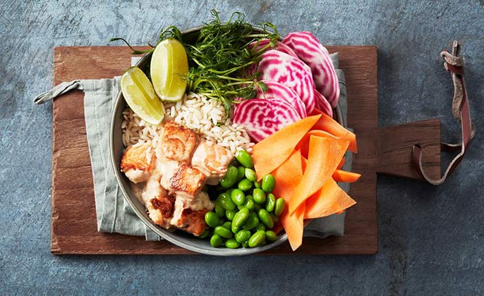 Koka riset enligt anvisning på förpackningen. Häll ner sojabönorna i riset när det är färdigkokt. Skala och strimla rotfrukterna och blanda med saften och skalet av lime. Skär laxen i kuber. Bryn laxen runt om i smör- & rapsolja i en stekpanna. Tillsätt crème fraiche. Låt puttra 2-3 minuter tills laxen är klar.