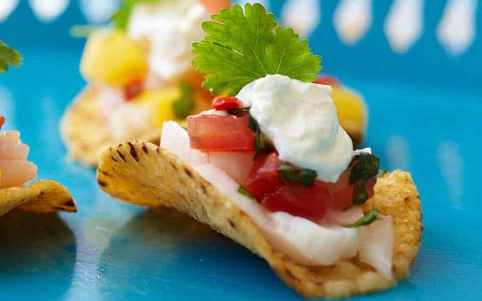 Ceviche är en latinamerikansk delikatess på rå fisk eller skaldjur som marineras med lime och chili. Serveras som här – på nachos som tilltugg eller till aptitretande förrätt.