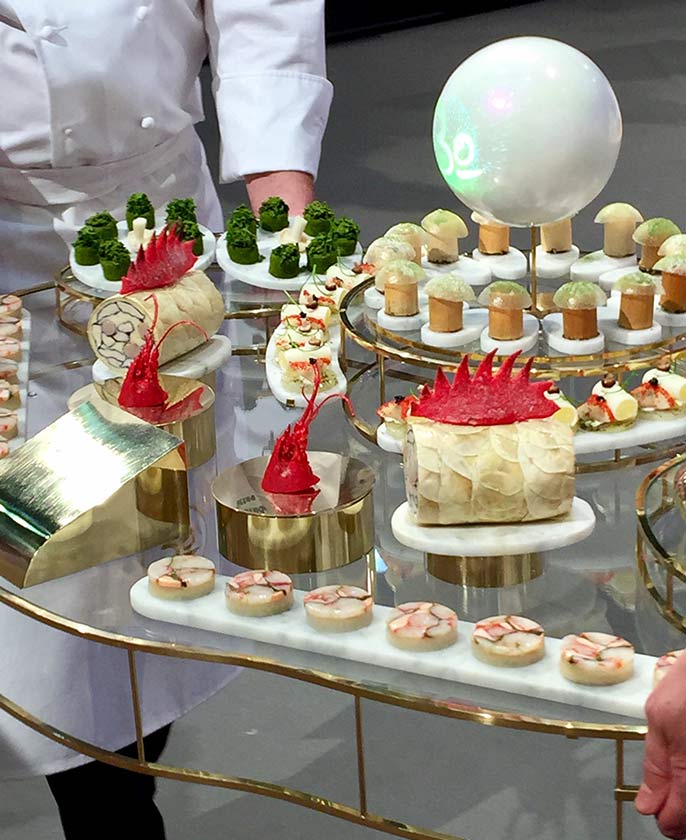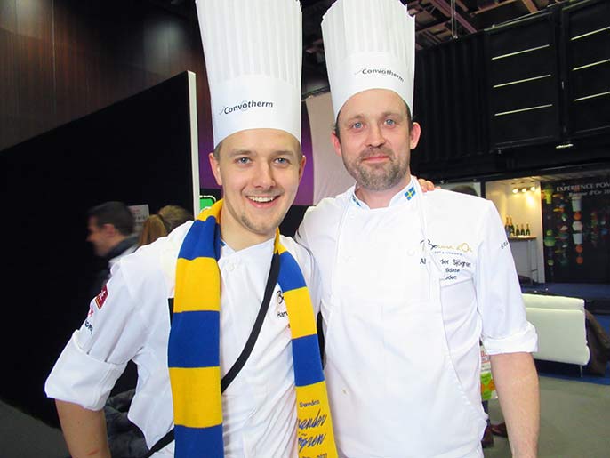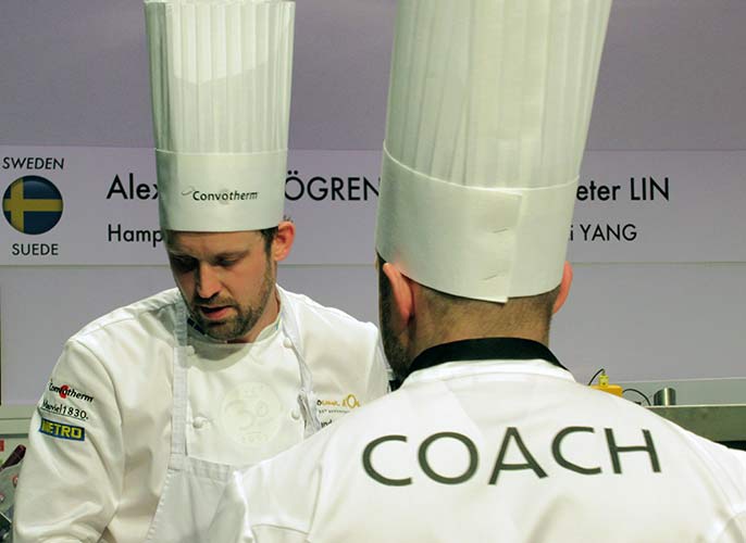 Alexanders Sjögrens team i Lyon, liksom i Budapest, består av coachen Jonas Lundgren, Hampus Risberg, commis (det vill säga Alexanders assistent, som för övrigt utsågs till tävlingens bästa i Budapest) och Henrik Norström, president för Svenska Bocuse d´Or Akademien. Henrik är även svensk juryrepresentant. Vi noterade att juryns medlemmar fick ett glas champagne till maträtterna i år, från den franska sponsorn Pommery.