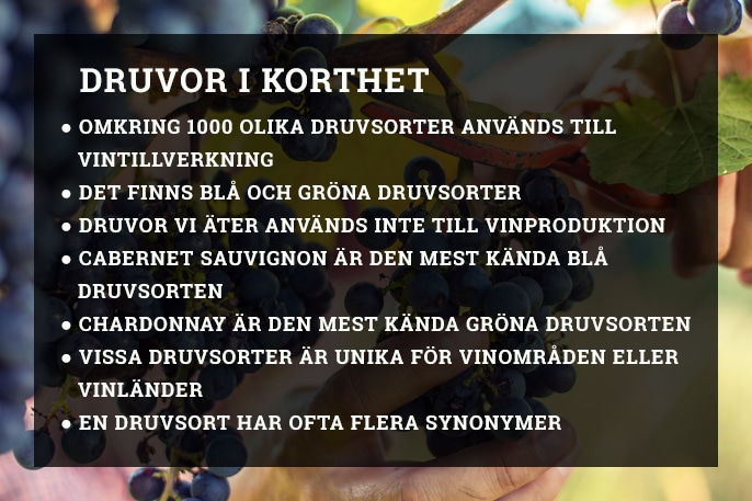 Vi räknar med att det finns omkring 800 till 1000 olika druvsorter för vintillverkning. Portugal, Italien, Spanien och Frankrike har flest unika druvor. Många länder i Nya världen har i princip samma druvsorter de gör vin på. Dessa är ofta importerade från Frankrike som alltjämt betraktas som det främsta vinlandet.