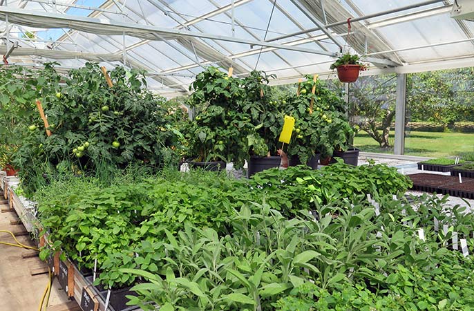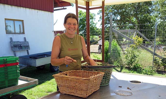– Om ni har sett filmerna om Gotlandspolisen Maria Wern på teve så kanske ni minns att flera scener i en av filmerna var inspelade på en gård med växthus – Gute Grönt. Det var här på Lilla Bjers som dessa scener spelades in, berättar Margareta och fortsätter med löken.