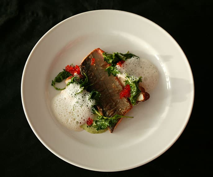 Övriga godsaker från PW kök & bars senvintermeny är bland annat smörstekt röding med rostad blomkålspuré, ostronemulsion, grönkål, rödingrom och musselsås. Här serverar kökschefen Tobias Jacobsen själv sina hungriga, sportiga matgäster.