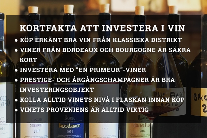 Ett sätt är att köpa viner ”en primeur” som man gör i Bordeaux, Frankrike. Man köper helt enkelt vin när det fortfarande ligger på fat och bara är något år gammalt. Då ska man se till att köpa vin från ett erkänt bra slott och från en bra årgång. Viner från dåliga årgångar tappar snabbt i värde.