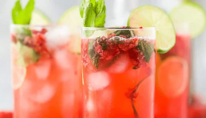 2. Muddla myntan och limeklyftorna. Tillsätt isen, hallonpurén, rommen och sodavattnet och blanda. Servera direkt.