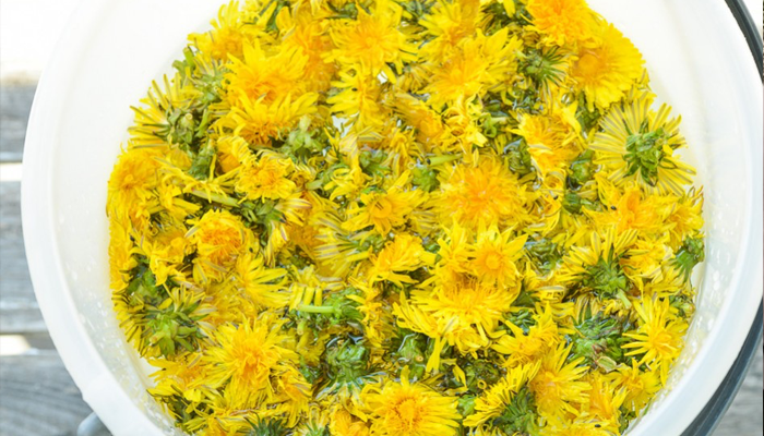 2. Lägg maskrosblommorna i en stor rostfri hink, plasthink eller plastbox som är godkänd för livsmedel och tål värme.
