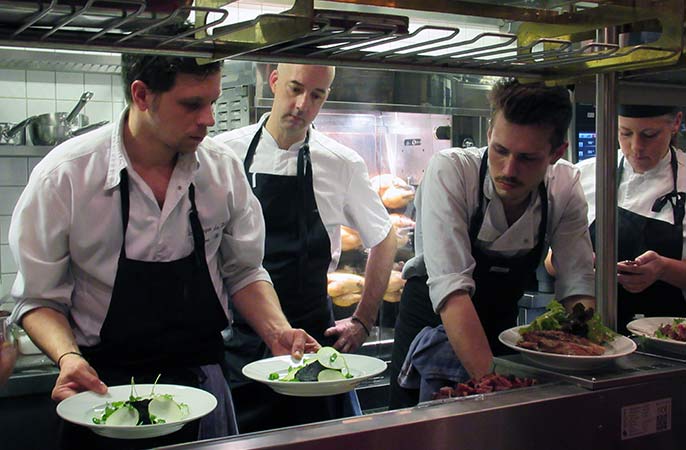 En fokuserad Lyonkock, Floriant Remont (t.v.) och hans team i köket på Luzette.