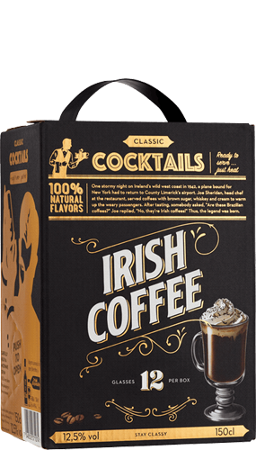 Irish Coffee på låda innehåller som sig bör en blandning av irländsk whiskey, råsocker och kaffe. Det enda du behöver göra är att värma drycken och toppa med lättvispad grädde. Lådan är på 1,5 liter, vilket räcker till inte mindre än tolv Irish Coffee. Boxen finns i Systembolagets beställningssortiment.