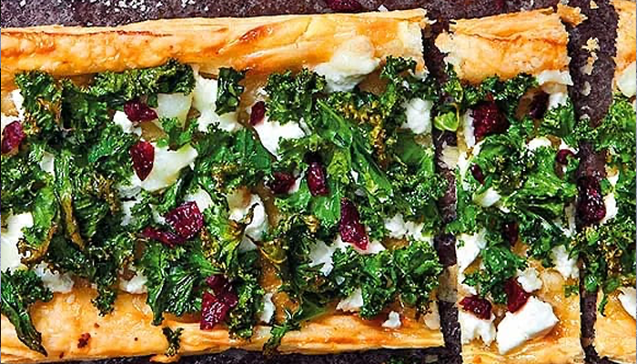 Sätt ugnen på 200°C. Dela smördegen längs med och lägg bitarna på en bakpappersklädd plåt. Bred ut crème fraîche och nagga botten med en gaffel. Grädda i mitten av ugnen ca 10 minuter. Ta ut och låt svalna lite. Massera grönkålen med olivolja och salt. Strö över smulad chèvre och kålen på smördegen. Grädda i mitten av ugnen ca 10 minuter. Ta ut och strö över hackade torkade tranbär. Skär i bitar och servera.