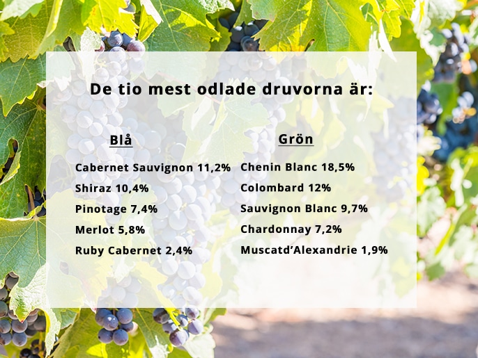 Den totala vinodlingen ligger på strax över 95 000 hektar, att jämföras med Spaniens 1 miljon hektar och Bordeaux 120 000 hektar. Trots en relativ litenhet, har landet lyckats profilera sig i vinvärlden och detta inte bara tack vare en unik druva som Pinotage, utan också tack vare spännande viner på i synnerhet de vanligaste druvorna, exempelvis Cabernet Sauvignon, Chardonnay, Merlot och Pinot Noir.