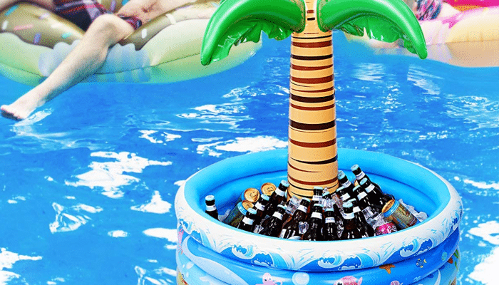 Vem orkar egentligen gå upp ur poolens sköna svalka för att hämta en öl eller drink? Då passar den här uppblåsbara poolkylaren i form av en palm perfekt. Bara fyll på med is och dryck och dagen är räddad.