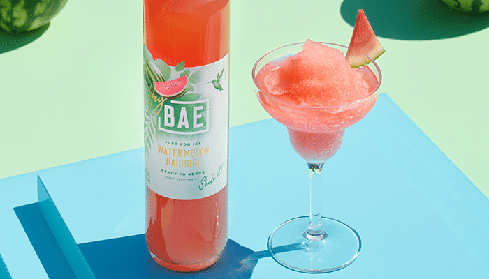 ”Hey BAE Watermelon Daiquiri är en fruktig, söt färdigblandad cocktail med fräsch smak av färsk vattenmelon. En drink som fungerar lika bra till brunchen som till middagsbjudningen och bör åtnjutas kall med ett glas fylld med krossad is och några limeskivor.” menar den svenska leverantören Tegnér Spirits & Wine.