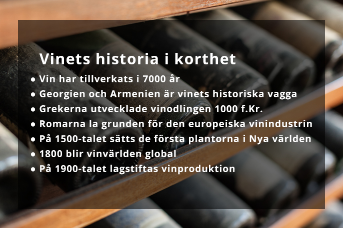 Någonstans i trakterna kring Svarta Havet ska vin ha producerats för första gången. Kanske blev det till av en slump, att man glömde bort must på druvor i ett kärl, det fick ligga till sig, det blev varmare ute och en jäsning satte därför igång. Sedan när man testade det, smakade det inte bara bättre, man mådde också bättre, blev lite gladare.