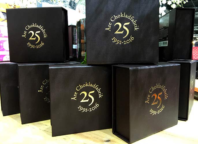 Åre Chokladfabrik fyller 25 år i år och firar det med en jubileumspralin – mörk chokladkola doppad i mörk choklad. ”25” heter den, kort och gott.