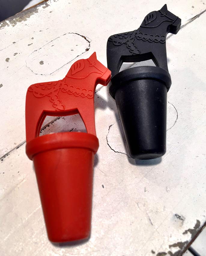 Andra roliga nyheter med svensk design som gemensam nämnare var små dalahästar i silikon från Pufz, utformade som vinkorkar. Och Sagaform lanserade glasnyheter i serien Club, där man vill skapa den lyxiga känslan av att befinna sig i en bar – fast på hemmaplan. Det serverades fräscha (alkoholfria) drinkar i tumblerglas och hela serien av barglas fanns till beskådan. Även denna serie når allmänheten i oktober.