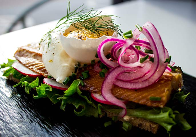 Montera smörrebrödet: sallad i botten på brödet, därefter rädisor, sillfilé, gräslök, crème fraiche och rödlök. Toppa med en äggula.