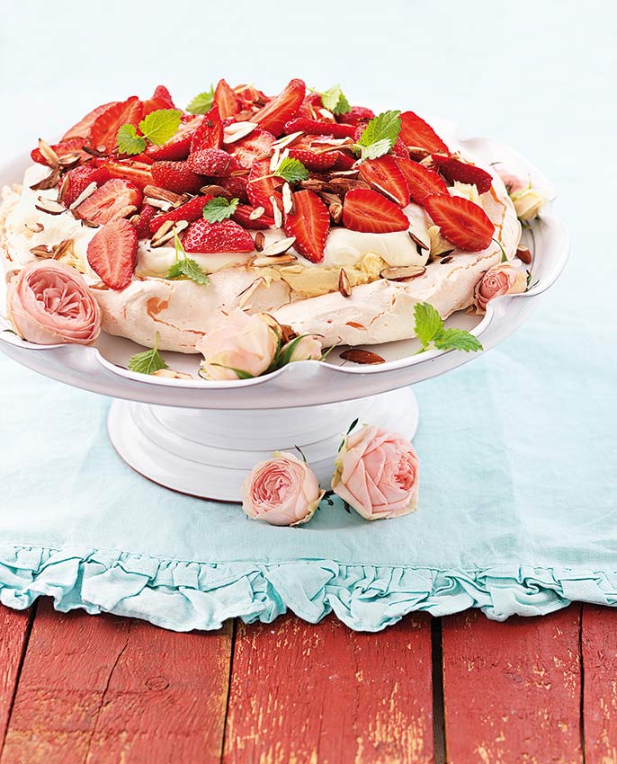 Anna Pavlova hette en rysk prima ballerina som föddes i slutet av 1800-talet. Hon turnerade världen över och har fått en tårtliknande marängefterrätt uppkallad efter sig. Två av alla länder som Anna Pavlova besökte, Australien och Nya Zeeland, vill båda hävda att pavlovan är deras nationalrätt. Därom tvista de lärde, men det tyder ju på att tårtan är både god och populär! Här är en variant med färska jordgubbar och rostad mandel.
