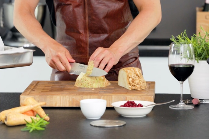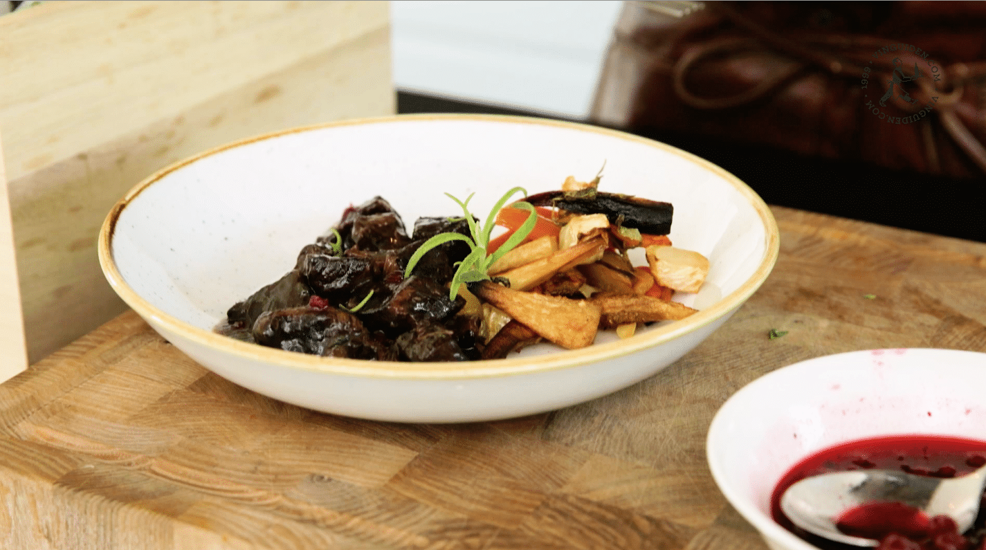 Servera de rostade grönsakerna tillsammans med viltgrytan.