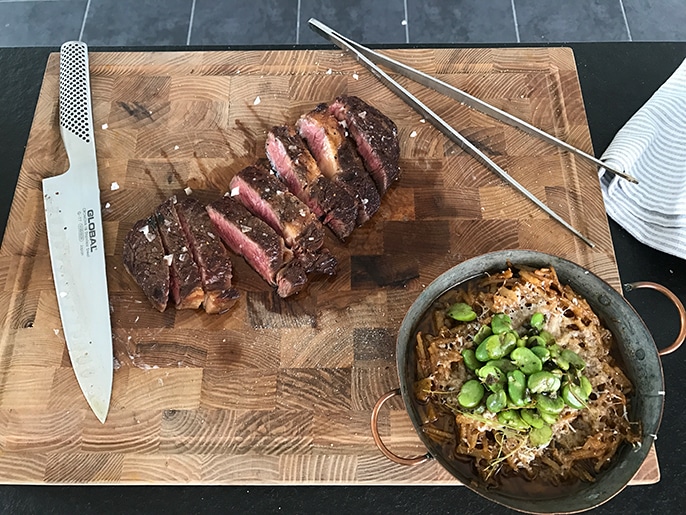 Servera den nystekta entrecôten med potatisanrättningen och bondbönorna.