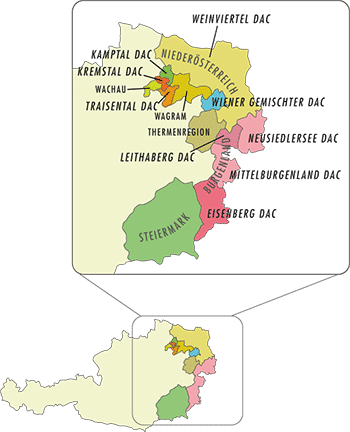Med de nya EU-reglerna delas vin i Österrike upp i 1. Vin utan geografisk indikation (tidigare bordsvin) – detta är den enklaste klassen och druvorna kan komma vart som helst ifrån i Österrike. 2. Vin med geografisk indikation (tidigare lantvin) – det måste anges från vilken region druvorna kommer samt 3. Vin med skyddat ursprung, Qualitätswein. I denna kategori ingår 9 stycken DAC – Districtus Austriae Controllatus, som kan liknas vid det franska AOC, det vill säga vin märkt med DAC får endast innehålla tillåtna druvor och ska produceras i enlighet med områdets DAC-regler. Regionen Wachau har en egen organisation – Vinea Wachau Nobilis Districtus, grundad 1983 och står utanför DAC-systemet.