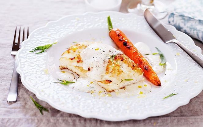 Lägg citron och dragon i såsen och mixa den slät och skummig. Smaka av med salt och peppar. Servera fisken med såsen, lättkokta morötter och eventeullt potatismuffins.