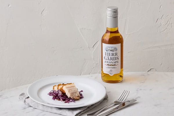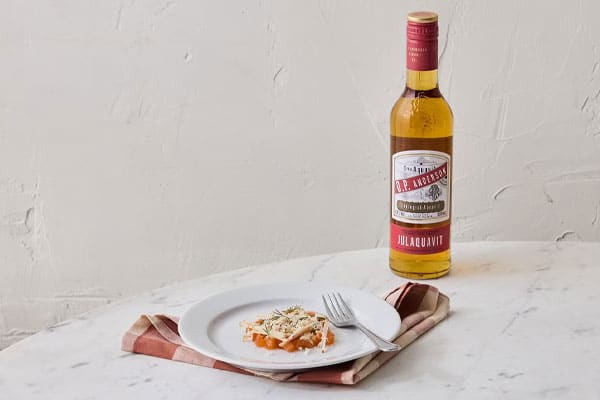 Eftersom O.P. Anderson Julaquavit är lite elegantare i stilen passar den perfekt ihop med både brödkryddor och citrus. Äpplet i rätten bidrar med friskhet och svarar fint mot den stilfulla kanelsmaken.