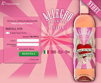 Denna ljusa rosé med fina, fruktiga inslag av röda körsbär, plommon, tranbär och rosa grapefrukt gör vinet till en utmärkt aperitif under sommarmånaderna. Allegro Rosato passar även utmärkt att avnjuta till lättare rätter av fisk och skaldjur samt krispiga sallader. Servera gärna till en skaldjurssallad med räkor och hummerstjärtar.
