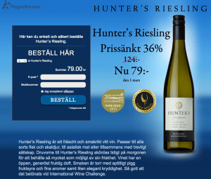 Hunter’s Riesling är ett fräscht och smakrikt vitt vin. Passar till alla sorts fisk och skaldjur, till asiatisk mat eller tillsammans med trevligt sällskap. Druvorna till Hunter’s Riesling skördas tidigt på morgonen för att behålla så mycket som möjligt av sin friskhet. Vinet har en öppen, generöst fruktig doft. Smaken är torr med aptitligt pigg fruktsyra och fina aromer samt liten elegant kryddighet. Så gott att det belönats vid International Wine Challenge.