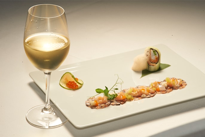 – En fin laxcarpaccio där man droppar över lite citron och en gräsig olivolja. Sedan strör man lite tunt skivad salladslök över och hyvlar till sist parmesanost. Det är lika enkelt som gott och en veritabel Vinho Verde-rätt.