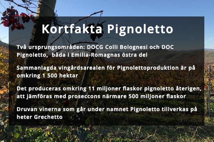 Hört talats om Pignoletto? Nej, trodde väl det. Men lägg namnet på minnet, för det kommer och det kommer stort. Det vet vi på Vinguiden. Vi var där för någon månad sedan. Där? Ja, i Bologna med omnejd, för det är där det tillverkas Pignoletto.