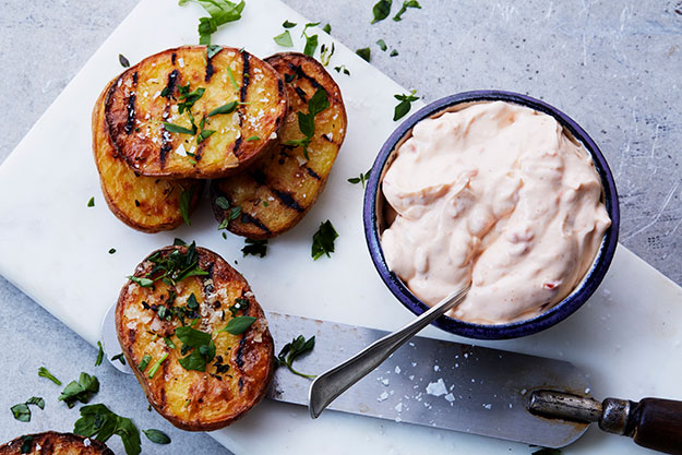 Borsta och dela potatisen i halvor. Koka den knappt mjuk i lättsaltat vatten. Låt den ånga av. Pensla snittytan med smör och salta. Grilla potatisen över glöden, eller i ugnen, tills den fått färg. Servera med créme fraîche och toppa eventuellt med persilja.