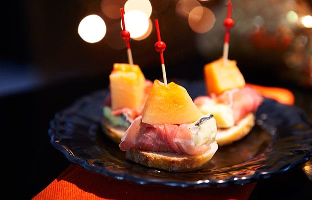 Så här gör du pinchos: Räkna med 3–5 pinchos per person. Du behöver 4 skivor smal baguette och 4 cocktailpinnar till varje recept. Dela osten i bitar och rulla in bitarna i skinkan. Lägg dem på bröden och toppa med melon. Om du vill kan du göra rörorna i förväg. Färdiga pinchos kan förvaras i kyl ett par timmar.
