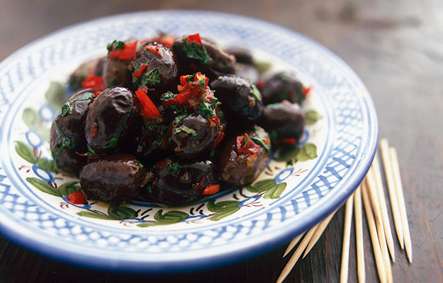 Sätt ugnen på 200°. Kärna ur och hacka chilin. Blanda oliver, chili, vitlök och smör & rapsolja i en ugnssäker form. Rosta i mitten av ugnen ca 15 min. Blanda i mynta. Servera oliverna varma eller ljumma.